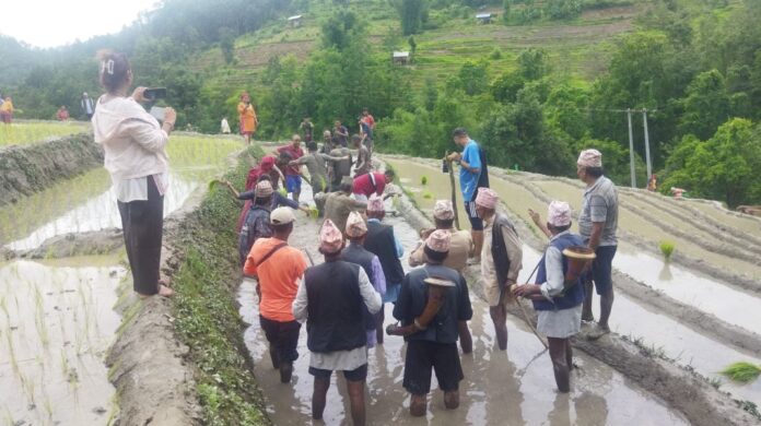 Nepali traditional Naumati baja, five pairs of bullocks, 29 Ropahars (paddy planters) and 18 Bauses (workers who level the paddy planting field)! Matane of Fidim-5 was turned into a bustling place on Tuesday.